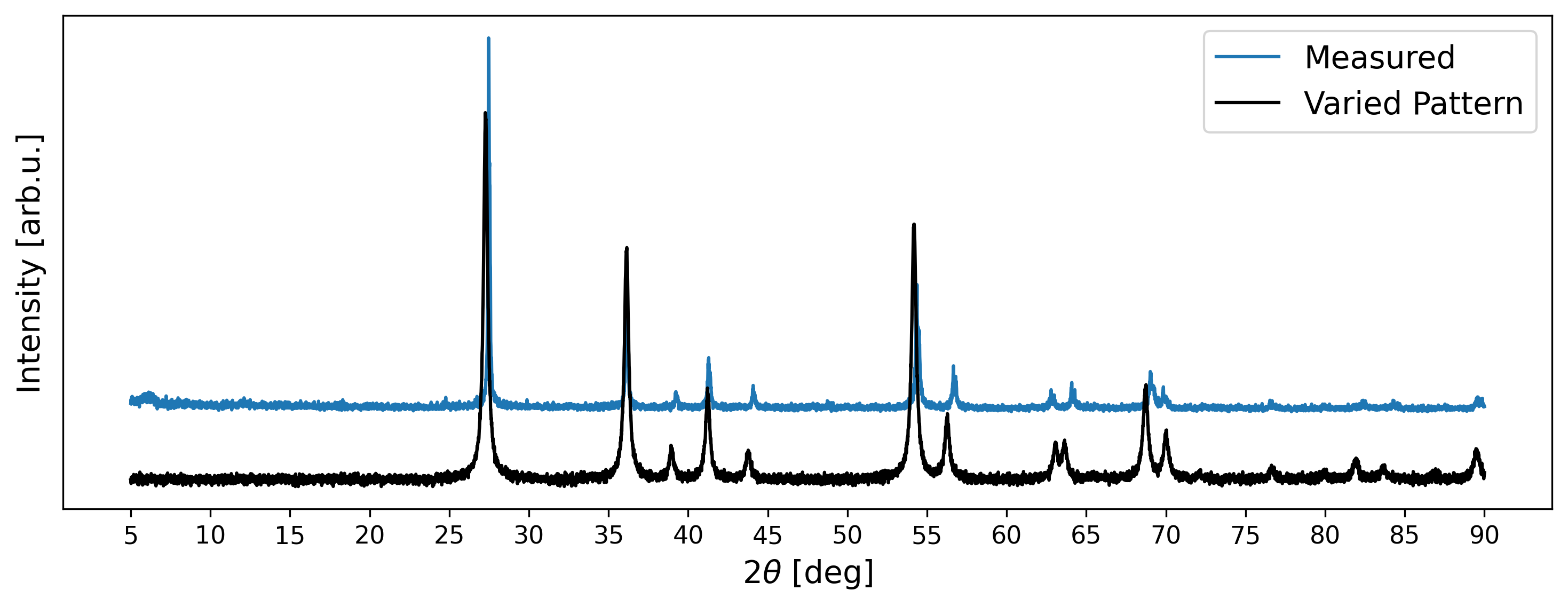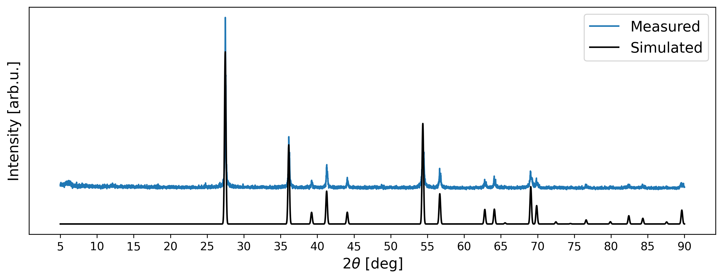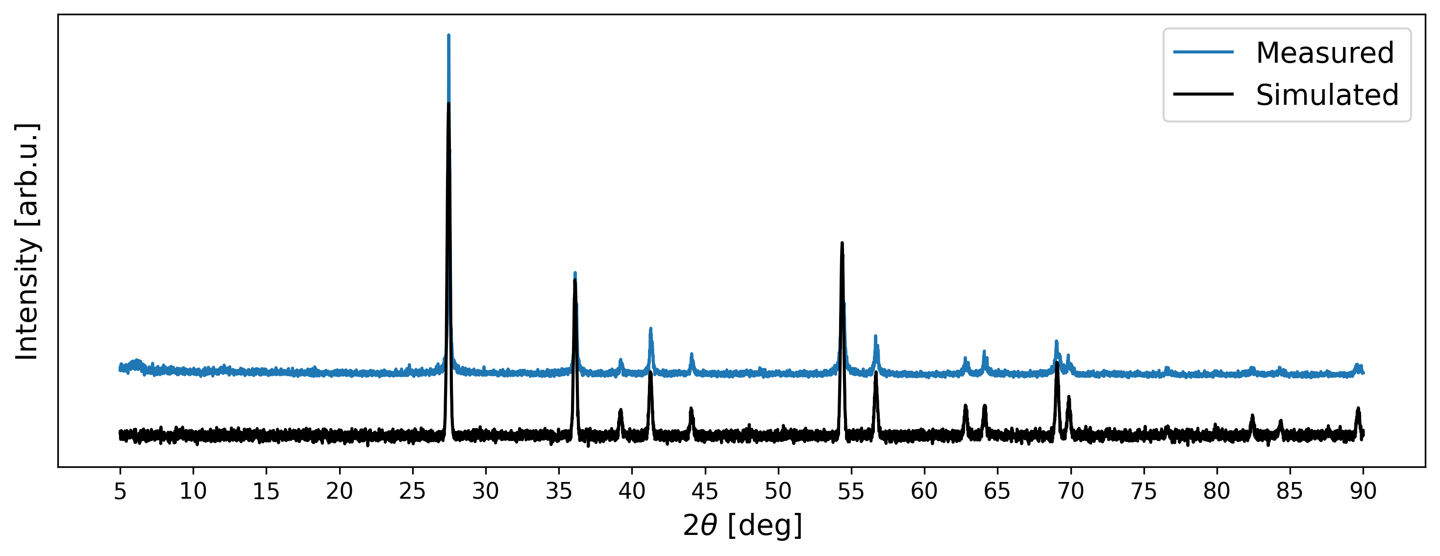 Although the generated XRD pattern looks visually similar to the measured signal, minor disparities persist. Firstly, there are slight deviations in peak positions attributable to a mismatch in lattice parameters. Secondly, certain simulated intensity peaks exceed the intensities observed in the measured data. Thirdly, disparities are evident in the shapes of peaks. Nonetheless, such deviations have to be expected in measured diffraction patterns.