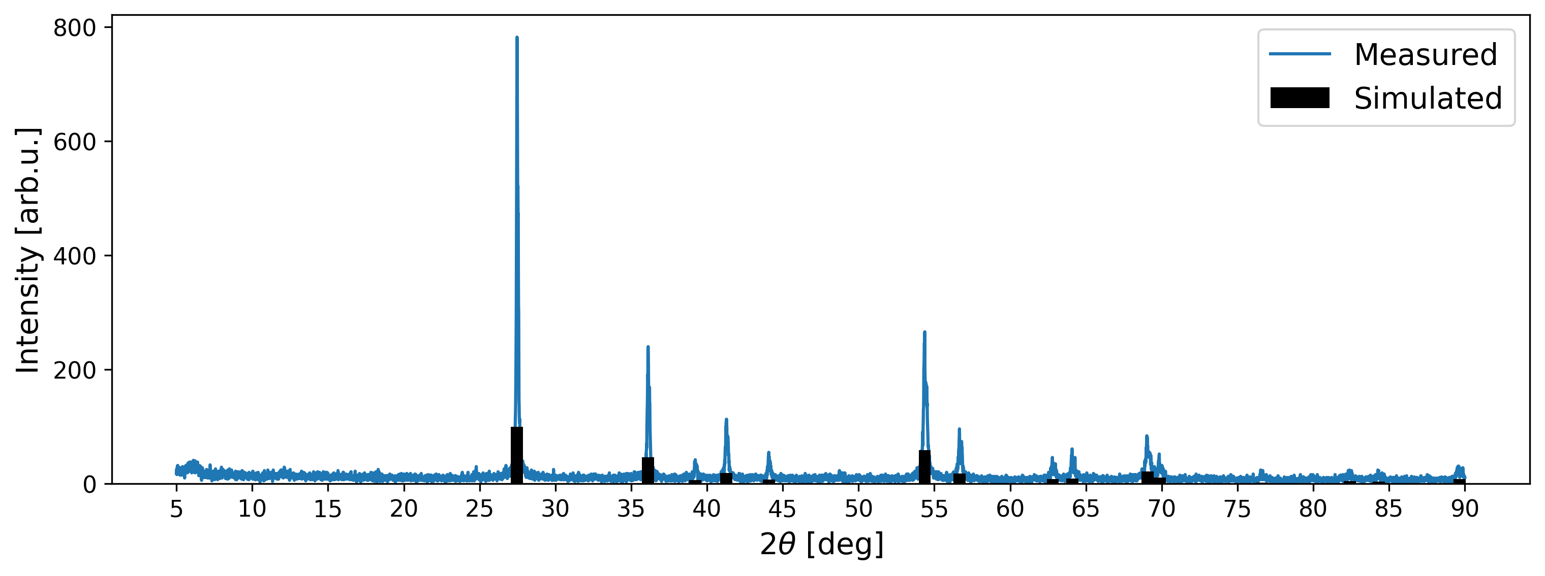 A visual comparison between the simulated data and the measured XRD pattern validates that the peak positions align. However, notable disparities arise in the intensities: while the highest peak in the measured signal registers at approximately 800 arb. u., the simulated peaks are scaled relative to the highest peak at 100 arb. u. The measured intensities are influenced by various factors, such as instrument configuration and acquisition time. As a result, XRD patterns are commonly analyzed based on the relative intensities captured in the signal. A straightforward method to align the scales of measured and simulated intensities involves scaling based on the minimum and maximum values in each scan, known as Min-Max-Scaling.